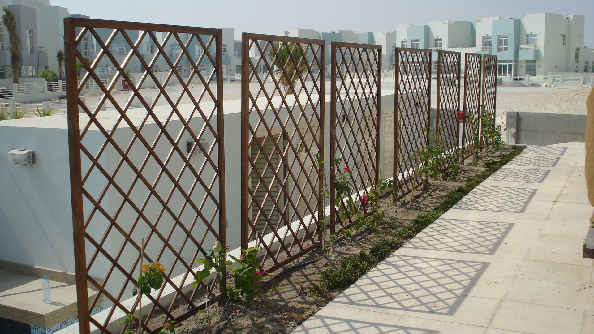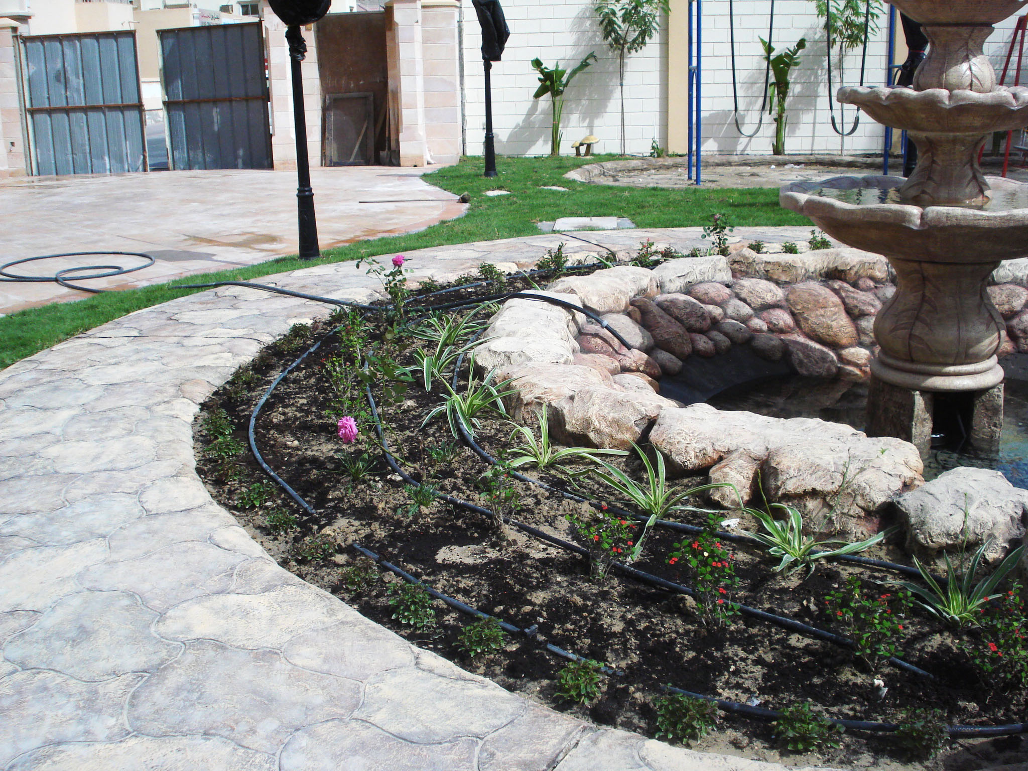 Out door garden accessories made of cement colored to match the scenery. Borders fencing for the garden or for the plants as plants pot and plants boxes.